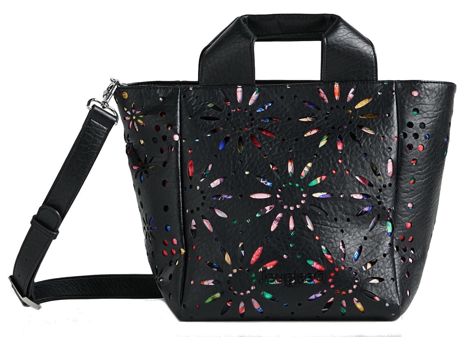 Ein absoluter Augenschmaus ist die Kurzgrifftasche Dandelion aus der Serie Valdivia von Desigual. Die unzähigen Material Ausstanzungen in Form von Blüten mit bunten hinterlegtem Colorblocking bringt ein zauberhaftes Accessoires hervor.