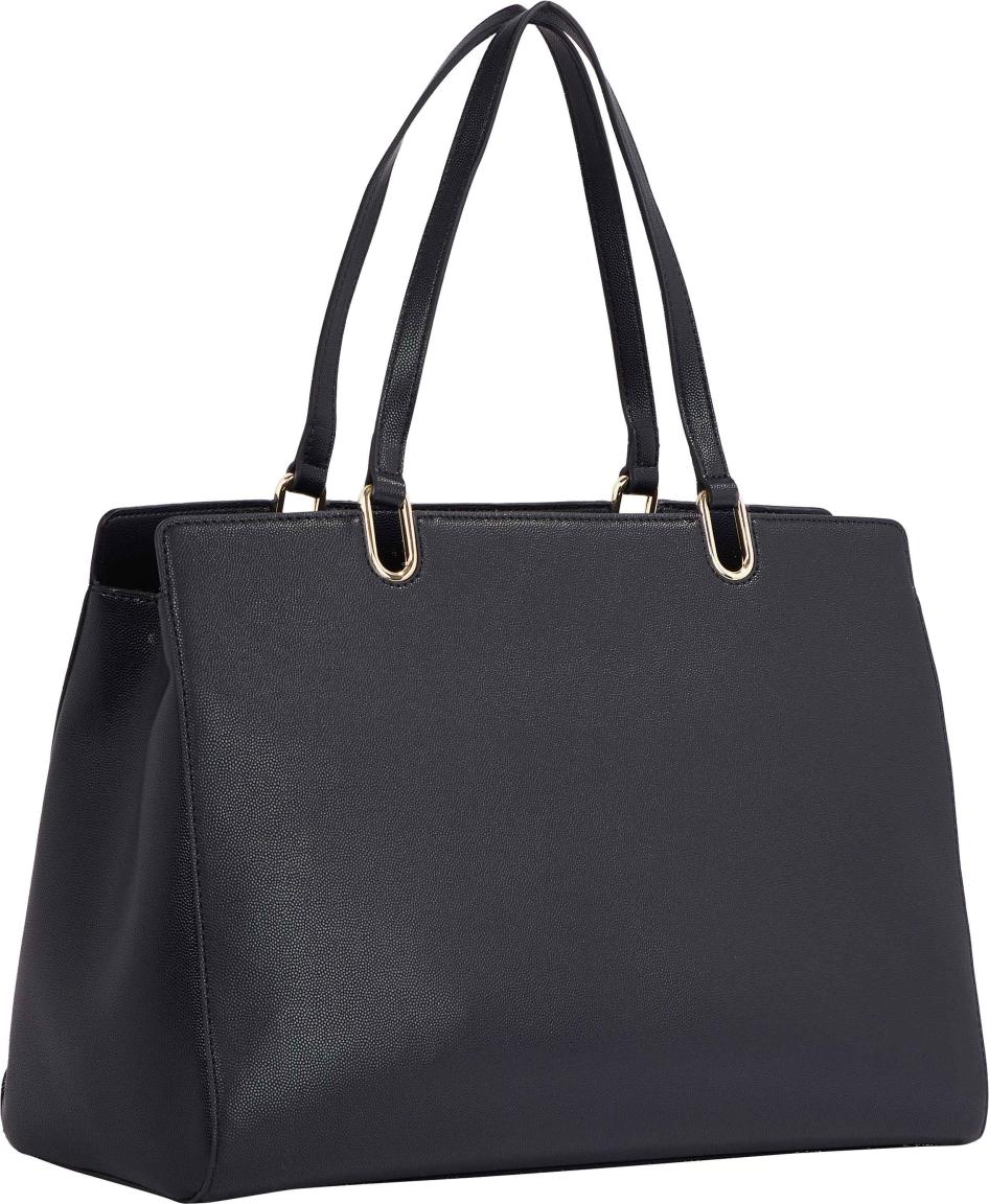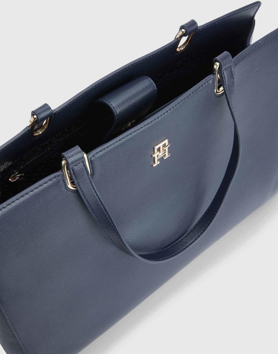Diese zeitlose Kurzhenkeltasche aus der Serie Tommy Timeless Satchel der Marke Tommy Hilfiger, ist aus robustem Lederimitat im kombinierfreundlichen Dunkelblau (Space Blue) gefertigt. Innen ist die Henkeltasche mit einem textilen schimmernden Stoff ausgekleidet, der die Markeninitialen wieder spiegelt.
