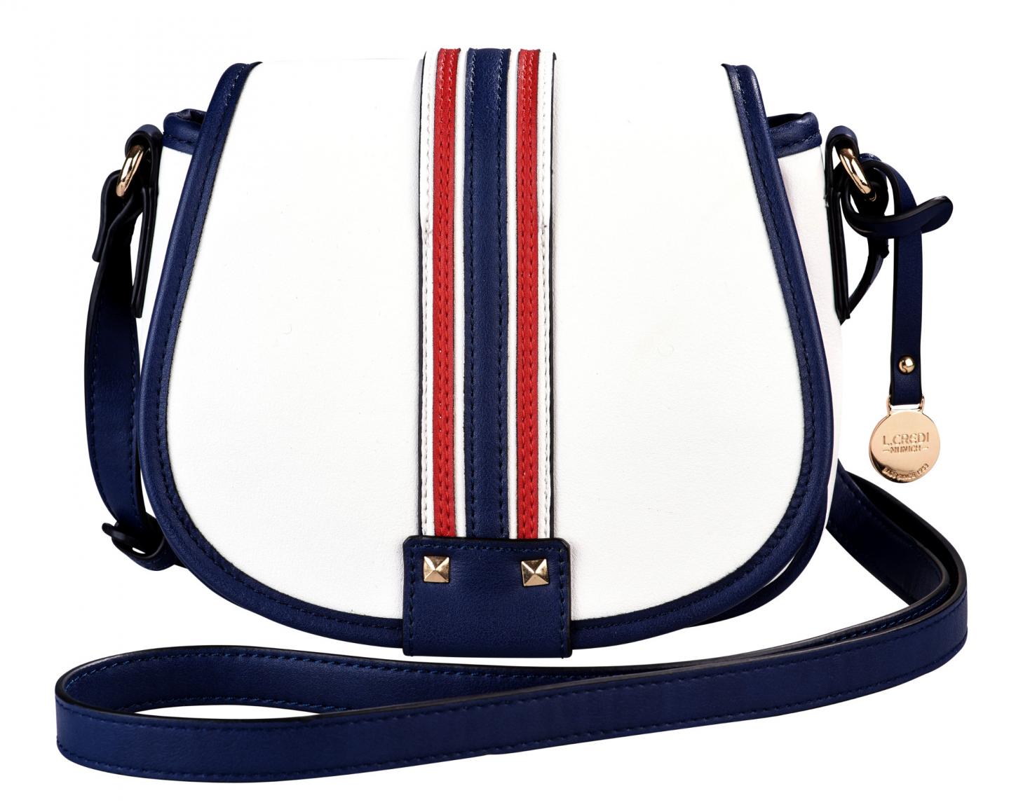 Diese wunderschöne weisse Überschlagtasche strahlt durch die dunkelblauen und roten Akzente mit goldfarbenen Aplikationen eine zeitlose Eleganz aus.