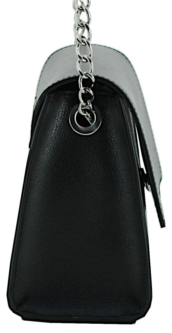 Eine besonders elegante Note verleiht der Schultertasche der silberfarbene Ketteneinsatz am Schulterriemen, der sich aber auch problemlos abnehmen lässt und in der Länge verstellbar ist.