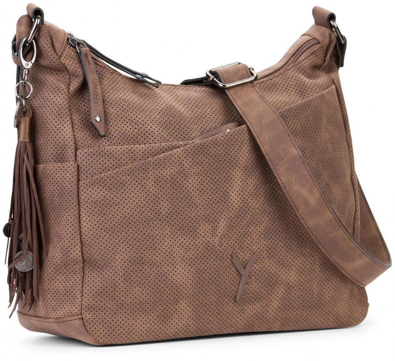 Diese Schultertasche aus der Serie Romy von der Marke Suri Frey ist aus hochwertigem, weichem Lederimitat in der Farbe brown (dunkelbraun) gefertigt. Die gesamte Umhängetasche ist mit unzähligen kleinen, gestanzten Löchern verziert, die Innenseite ist komplett mit Textilfutter in grau ausgestattet.