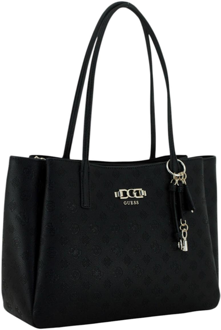 Geräumige Guess Anise Shoppertasche aus geschmeidigem Kunstleder in Schwarz. Genarbte Oberfläche mit ikonischer Logoprägung und Metallemblem. Durchdachte Einteilung mit Laptopfach - ideal für Alltag, Uni und Büro.