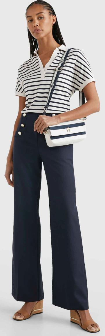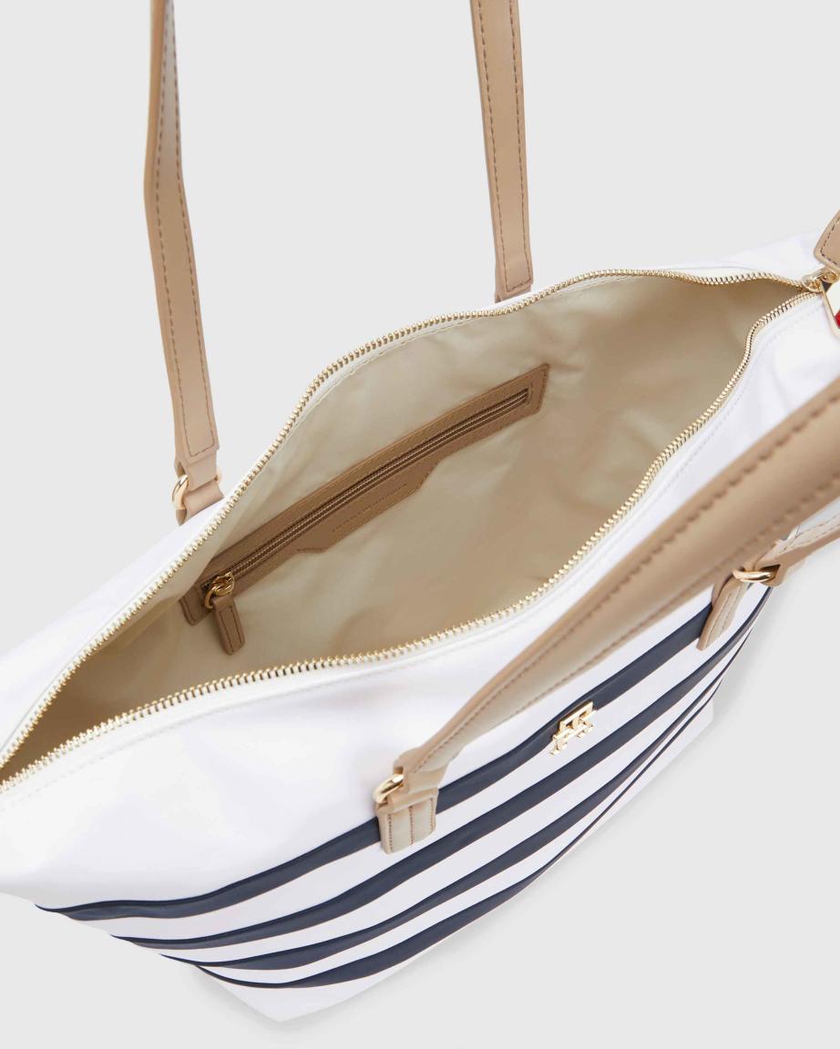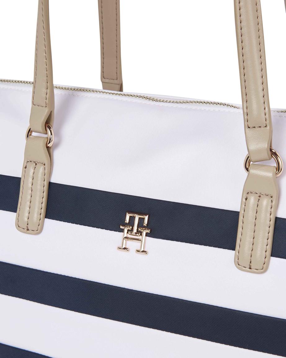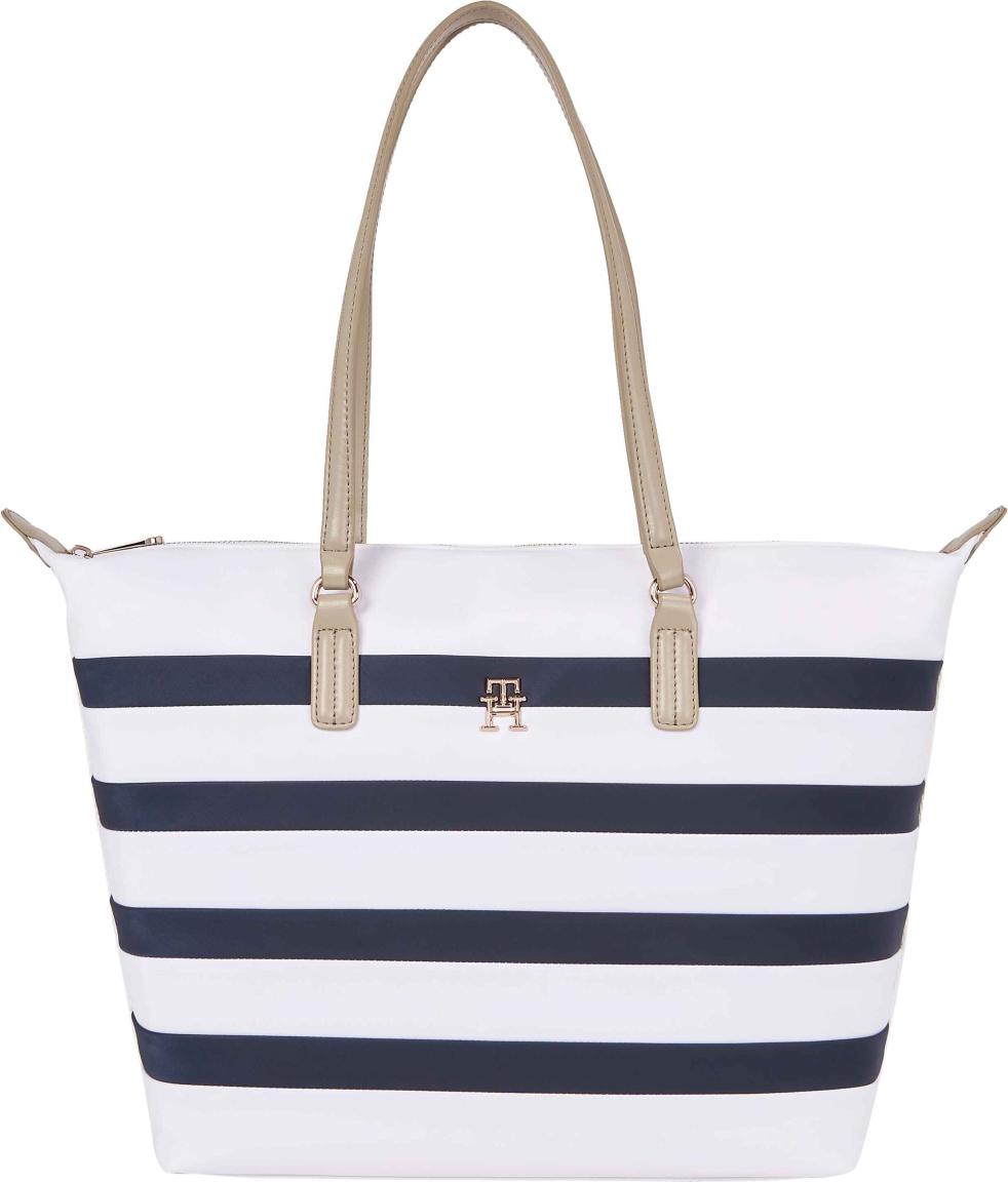 Dieser robuste Shopper der Marke Tommy Hilfiger aus der Serie Poppy Tote Corp ist aus strapazierfähigem Nylon in der maritimen Farbkombination Weiß Blau gestreift und hat zusätzlich Details die aus Kunstleder gefertigt wurden. Seitliche vertikale Ripsband-Streifen mit den charakteristischen Farben der Marke vollenden das Design der praktisch und stylischen Einkaufstasche. Auf der Vorderseite befindet sich mittig das Emblem aus glänzend goldfarbenen Metall.