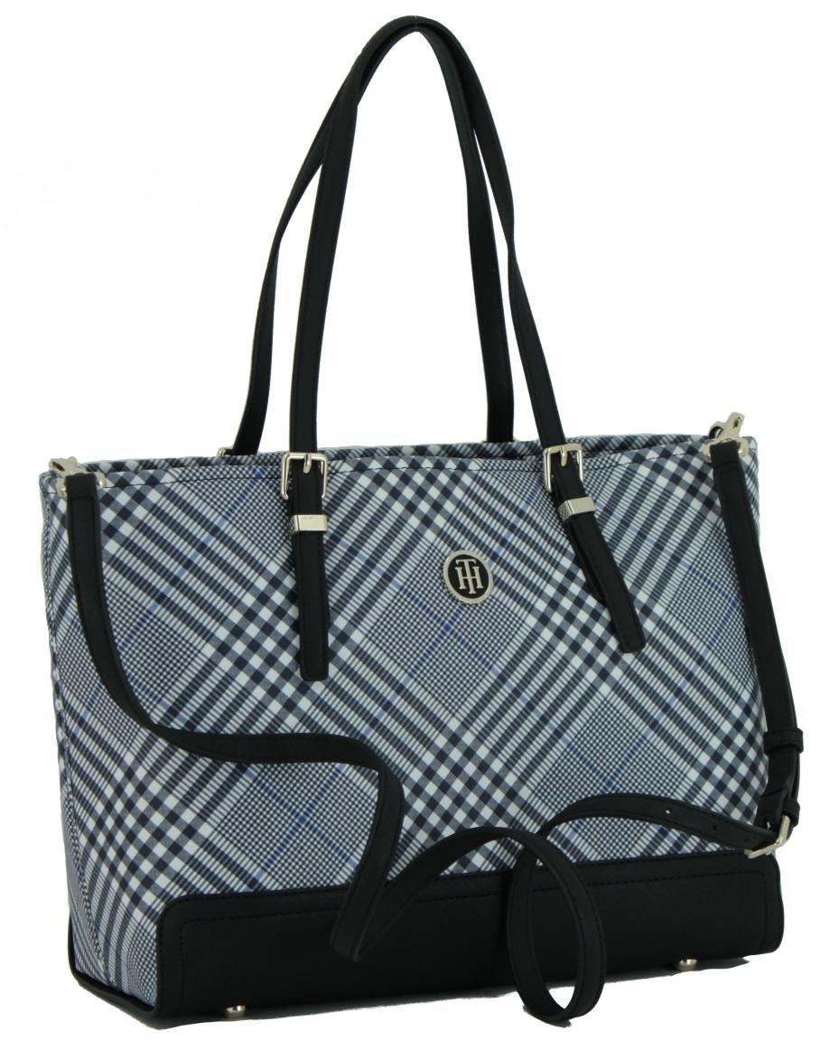 Der Shopper von Tommy Hilfiger aus der Serie Honey Med Tote Print ist aus hochwertigem Lederimitat gefertigt. Die feste Kunstleder-Oberfläche ist leicht strukturiert und dadurch sehr unempfindlich. Die gesamte Tasche ist mit einem Karo-Muster in zwei verschiedenen Blautönen bedruckt.