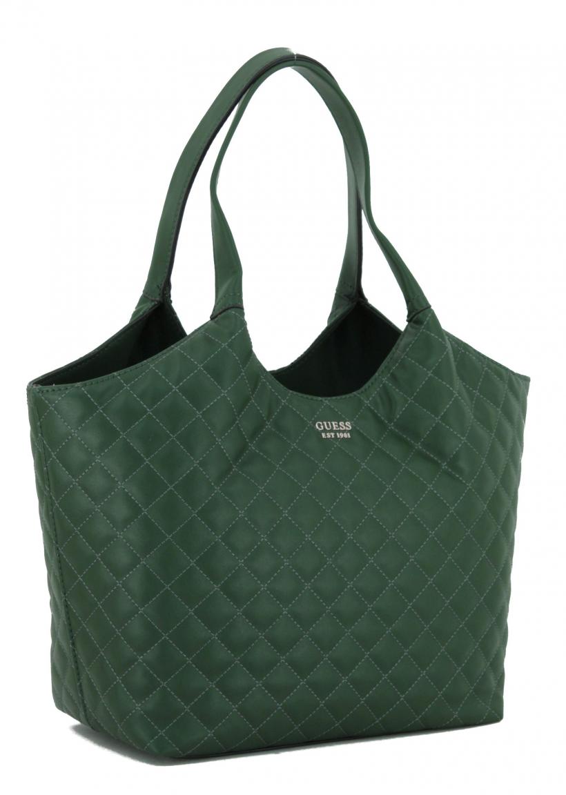Diese geräumige Beuteltasche aus der Serie Miriam von Guess ist aus hochwertigem Glattlederimitat in dunkelgrün gefertigt. Die rautenförmigen Steppnähte verleihen der Henkeltasche das gewisse Etwas.