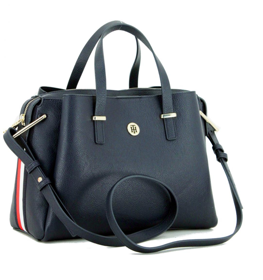 Diese außergewöhnliche Henkeltasche von Tommy Hilfiger aus der Serie TH Core Satchel ist aus hochwertigem dunkelblauen Lederimitat gefertigt. Die Oberfläche ist authentisch genarbt. Die Seiten der Kurzgrifftasche zieren applizierte Bänder mit den Corporate Stripes. An der Vorderseite der Henkeltasche befindet sich ein Monogramm-Emblem.