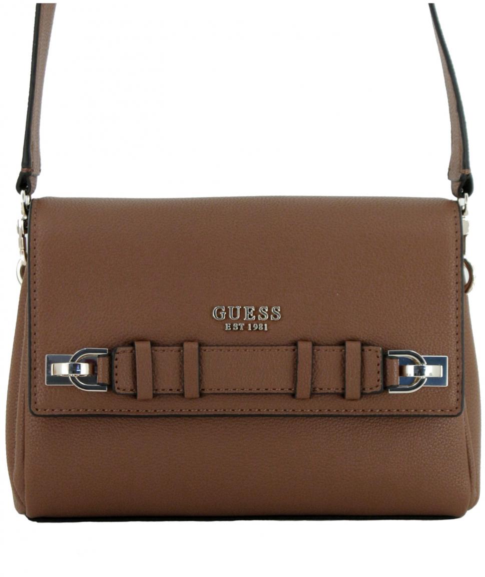 Den Überschlag der Umhängetasche ziert ein dezenter Markenschriftzug in glänzend goldfarbenem Metall. Ein richtiger Eyecatcher ist jedoch der Zierriemen, der mittels auffälliger Metallelemente an der Vorderseite der Tasche befestigt ist.
