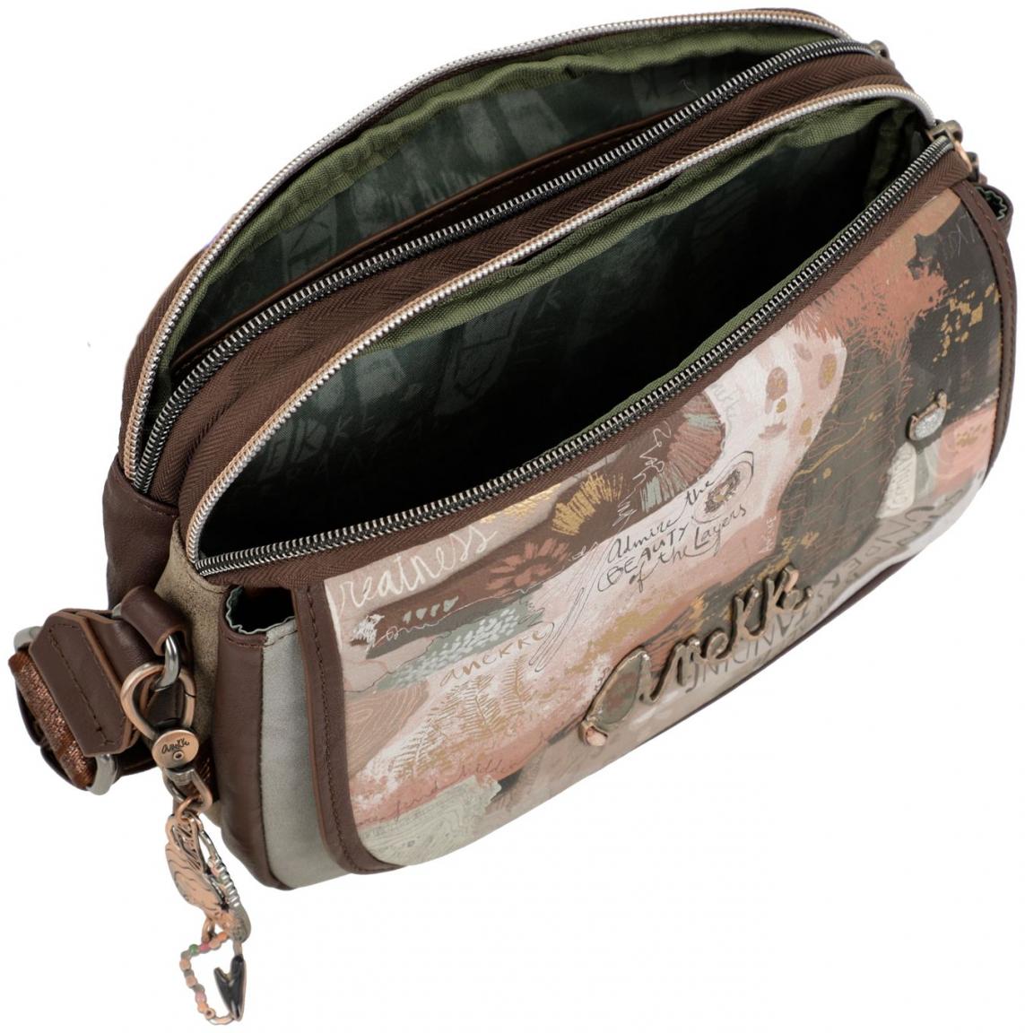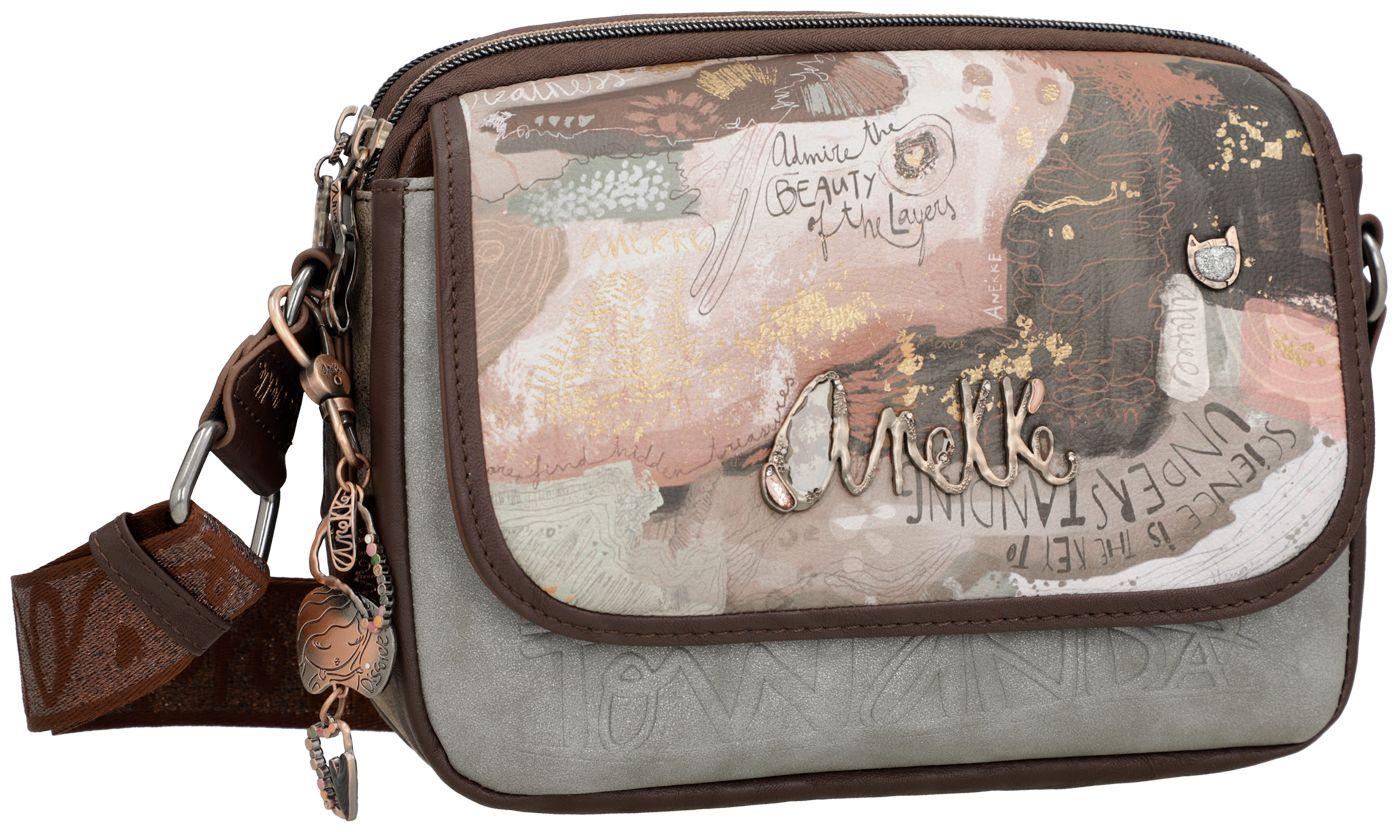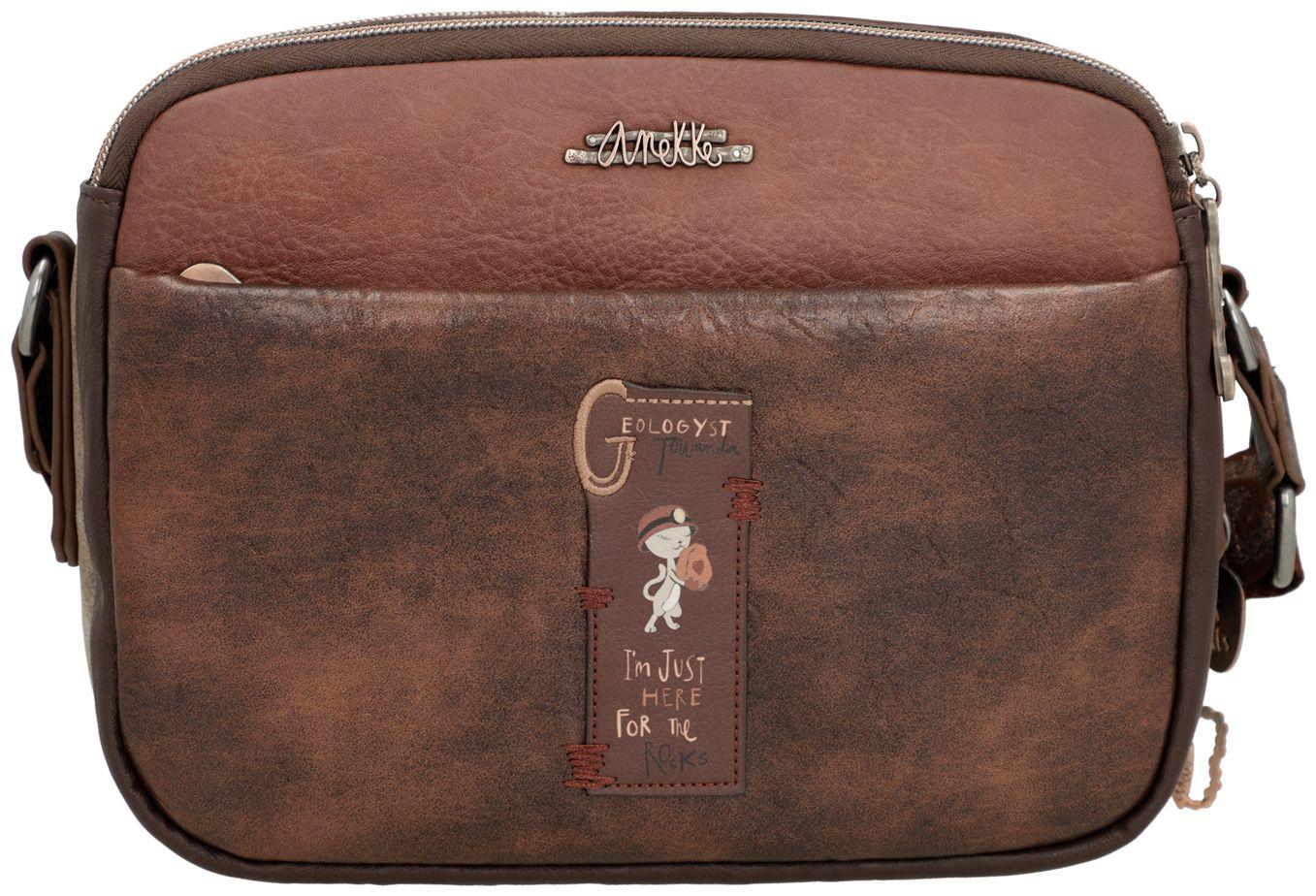 Ein kunstvoll gestaltetes Markenemblem passt sich dem ungewöhnlichen Design der Crossover Bag ebenso perfekt an wie die Zipanfasser und die Plakette mit Towanda als geologischer Forscher an der Rückseite. Die natürlichen Farbtöne und das oft unterschiedlich glänzende Kunstleder ergeben ein harmonisches Gesamtbild.