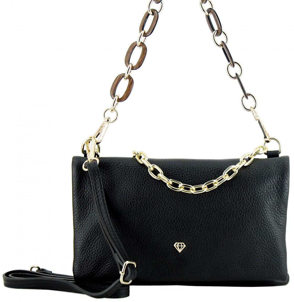 Ein ganz besonderer Blickfang ist die auffällige Kette, die an der Handtasche fixiert ist, diese kann als kurzer Schulterriemen verwendet werden. Ein weiterer kürzerer Riemen aus angesagtem Materialmix ist ebenso mittels Karabiner abnehmbar, wie der stufenlos verstellbare lederne Schultergurt.