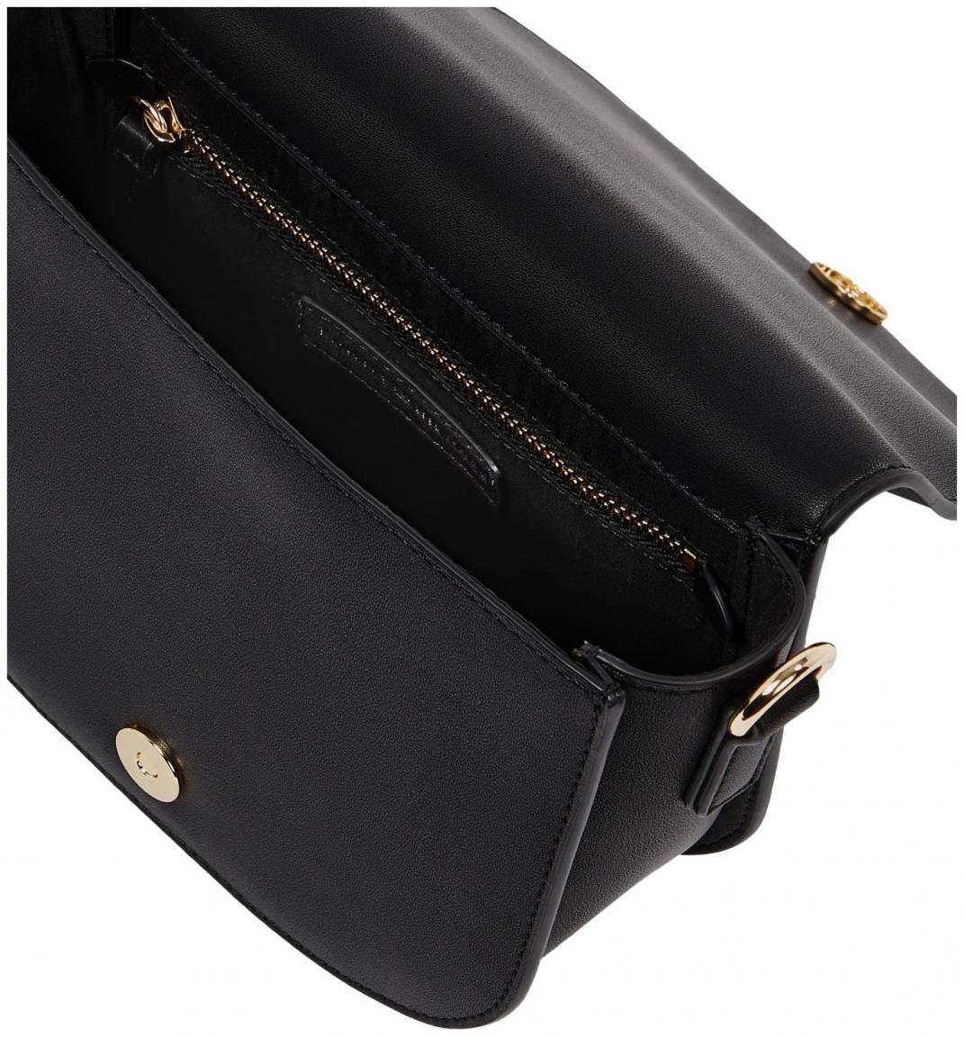 Die Umhängetasche wird mittels Überschlag und Magnetdrücker geöffnet und lässt den Blick auf ein schwarzes Textilfutter frei.