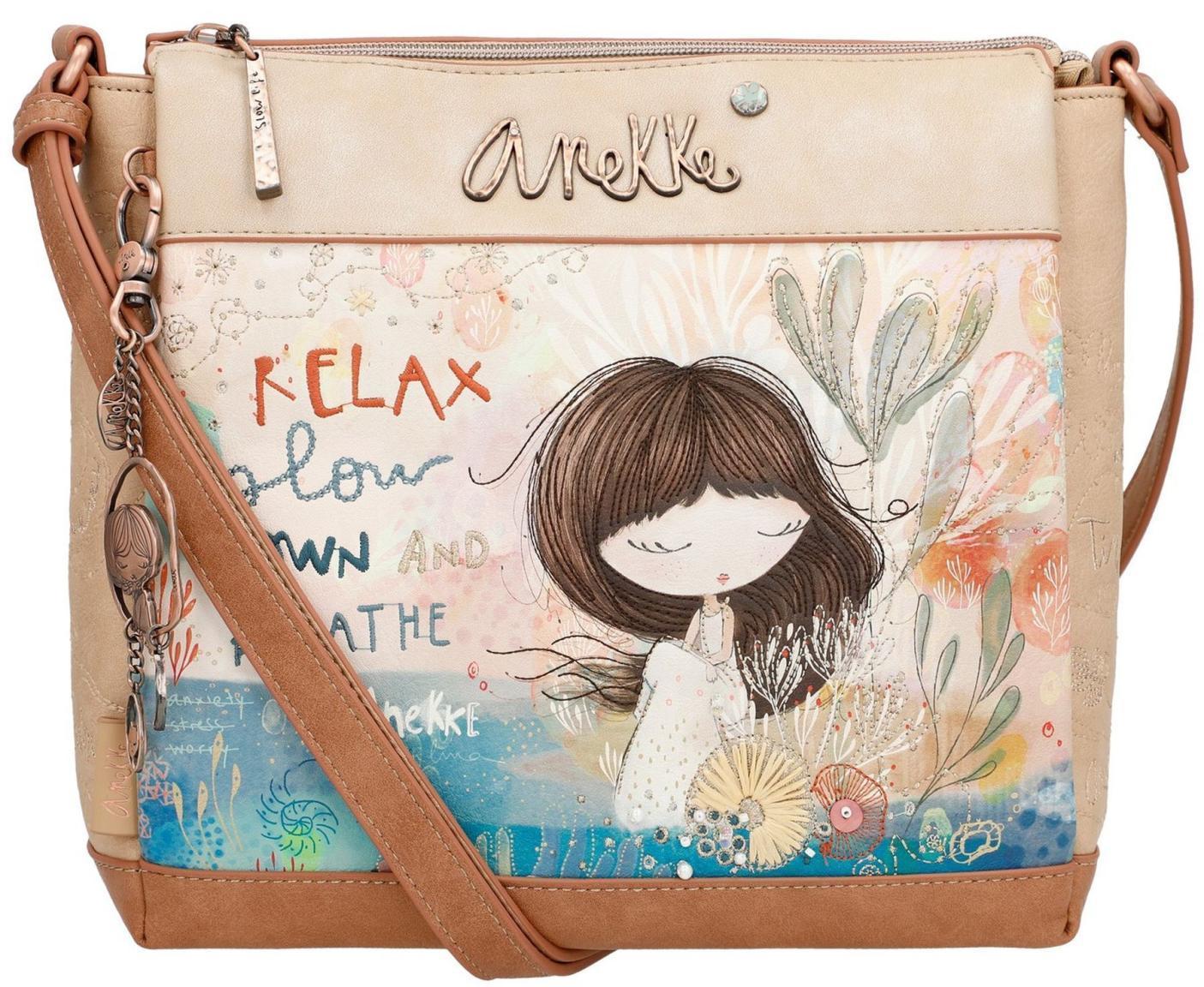 Die Umhängetasche aus der Serie Mediterranean der Marke Anekke ist aus hochwertigem Lederimitat mit bezaubernden Comicprint gefertigt. Zart pastellige Farben ergeben ein harmonisches Gesamtes. Viele unterschiedliche Stickapplikationen in bunten Farben sowie auch mit Glitzer, kleinen Steckperlen und Perlmutt umrahmen Mächen Anekke, welche am Meer gerade ihren Tagträumen folgt.