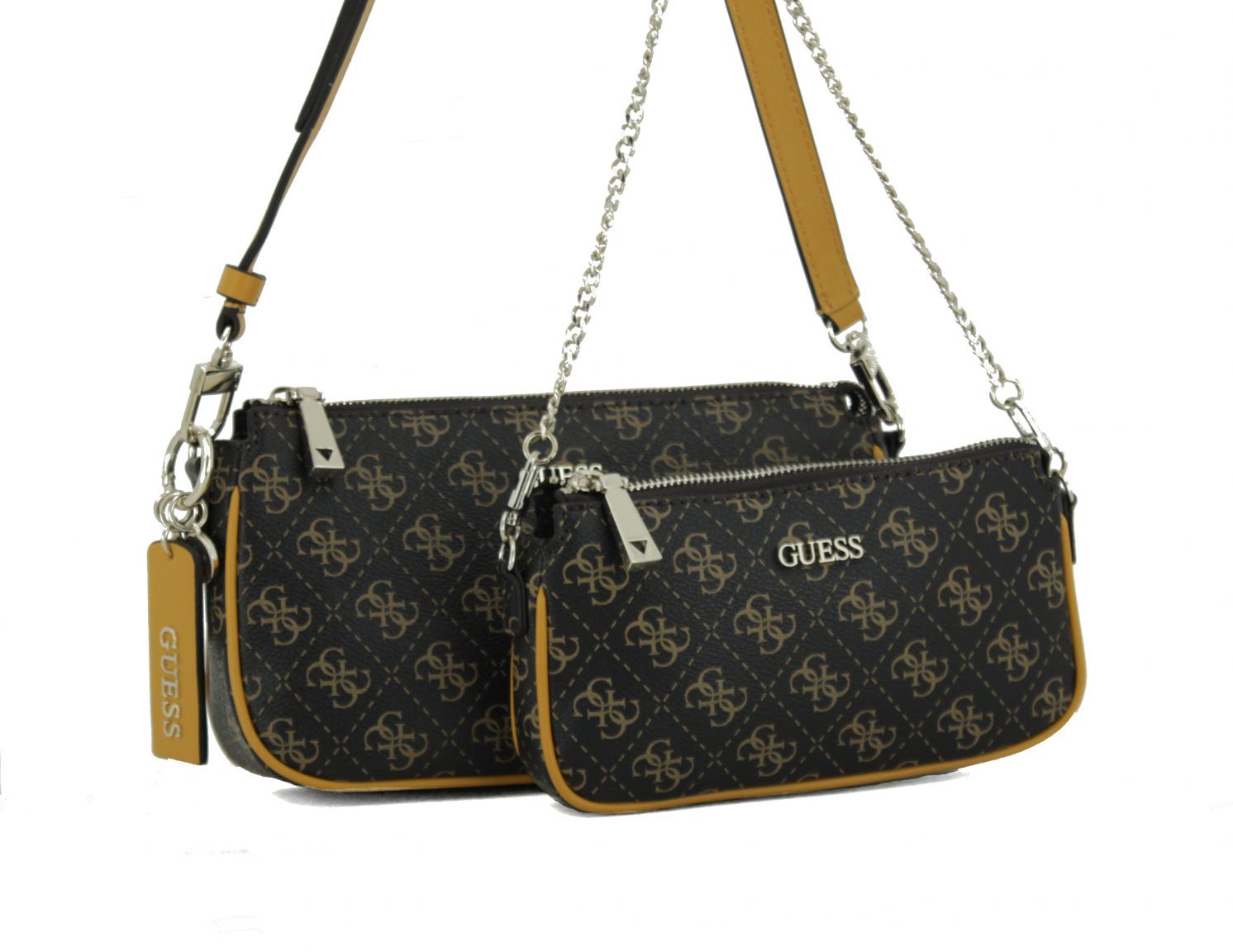 Bei diesem praktischen Umhängetaschen-Set aus der Serie Arie mini von der Marke GUESS können Sie aus eins auch zwei machen. Der Alloverprint auf beiden braunen Taschen in Kombination mit farblichen Applikationen machen die Crossbody Bag zu einem echten Schmuckstück.