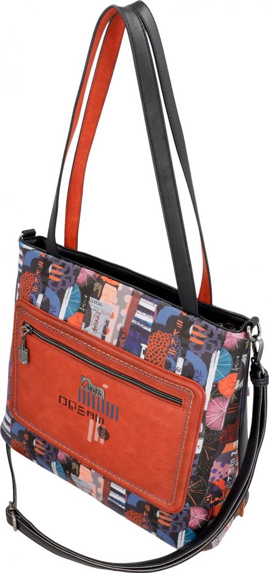 An der Rückseite ist die Handtasche mit einem farbenfrohen abstrakten Print versehen. Das aufgesetzte Reißverschlussfach ist aus rotem Kunstleder gestaltet.