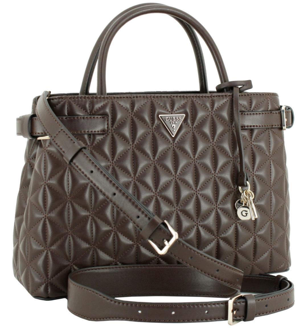 Ein ikonisches Guess-Logo, das die Dreieckform der Steppung wieder aufgreift, ziert die Vorderseite der Henkeltasche. Als zusätzlicher Eyecatcher bringt die Handtasche einen auffälligen Metallanhänger mit, der ihr eine leicht verspielte Note verleiht. Dieser wird mittels Kunstlederband am Tragehenkel befestigt, kann für einen schlichteren Look jedoch auch einfach abgenommen werden.