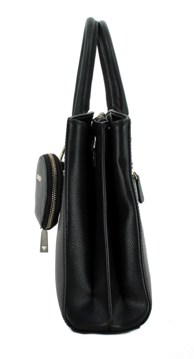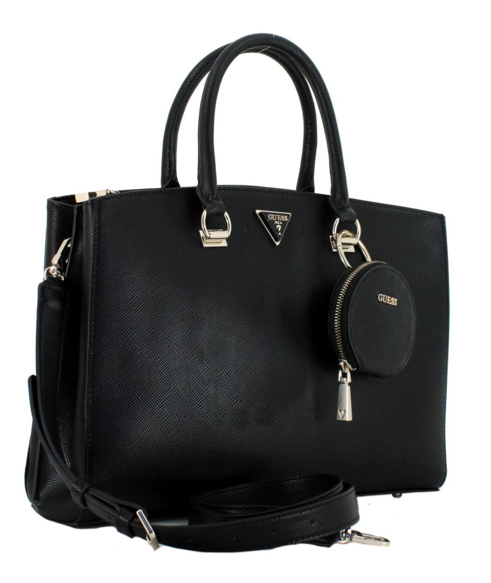Mit dieser edlen Kurzgrifftasche aus der Serie Alexie der Marke Guess kann Frau einfach nichts falsch machen. Im klassischem Schwarz (Black) mit genarbten und glanzvollem Finish bereitet diese Damentasche Freude am zeitlosen Accessoire. Kein Wunder, wenn diese Businesstasche unser neuer Alltagsbegleiter wird. Aber nicht nur optisch kann diese Schultertasche punkten. Sie bietet ein dreigeteiltes Hauptfach, mit hellem Textilfutter, das dafür sorgt, dass ordentlich verstaute Gegenstände schnell gefunden und erreicht werden können.