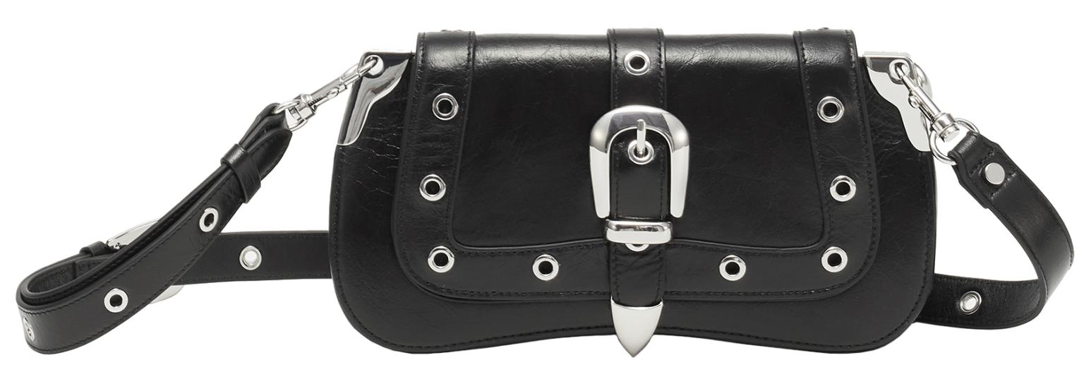 In rockig frechem Look zeigt sich die Überschlagtasche Luna aus der Rivet Glossy Kollektion von Les Visionnaires. Die Schultertasche ist aus glänzendem Crinkle-Leder im in klassischem Schwarz (Black), durch die auffälligen Nieten und die großen Schnallen wird die Schultertasche zum echten Eyecatcher. Silberfarbene Hardware unterstreicht den außergewöhnlichen Styl der Überschlagtasche.