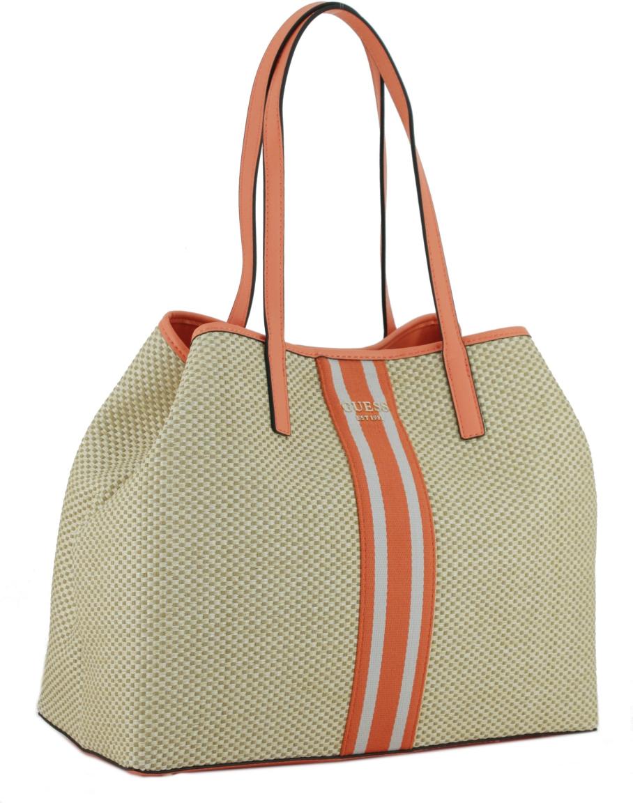In ganz sommerlichem Style zeigt sich der Klassiker Vikky von Guess. Kunstlederdetails in leuchtendem Orange verleihen der Henkeltasche aus grobem Baumwoll-Mischgewebe einen frischen und modernen Look. Die Vorderseite des Shoppers ziert ein Webband in Orange und Offwhite.
