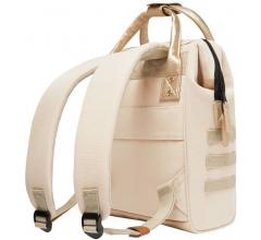 Der Clou an diesem Rucksack ist die austauschbare Fronttasche. Diese wird einfach mittels Gurten und Druckknöpfen am Rucksack befestigt und kann, wenn ein anderer Style gewünscht ist, einfach ausgewechselt werden. Eine Fronttasche ist Beige und die andere glänzend goldfarben.