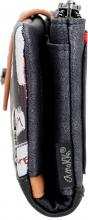 Gefertigt ist die Geldbörse aus dunkelbuntem Kunstleder. An der Vorderseite des Portemonnaies sehen wir abstrakte Formen in kräftigen Farben auf schwarzem Grund. Der modern gestaltete Markenschriftzug passt hervorragend zu dem außergewöhnlichen Design des Geldbeutels.