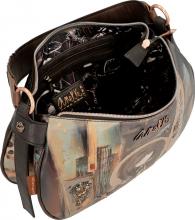 Das Hauptfach der Schultertasche ist per Reißverschluss zu öffnen. Im Inneren ist die Beuteltasche mit einem farblich und thematisch abgestimmten Textilfutter ausgestattet.