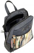 Gefertigt ist der Damenrucksack aus glattem Kunstleder in dunklem Blau. Die Vorderseite zier ein farbenfroher abstrakter Print, der mit vielen weißen Perlen bestickt ist. Auch das glamourös gestaltete Markenemblem passt sich dem Look des Backpacks hervorragend an. Als kleine Metallapplikation sehen wir Anekke auf einem Regisseur-Stuhl sitzend.