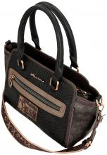 Ein besonderer Eyecatcher ist der abnehmbare Metallanhänger an der Vorderseite der Henkeltasche der perfekt mit dem üppigen Markenschriftzug harmoniert.